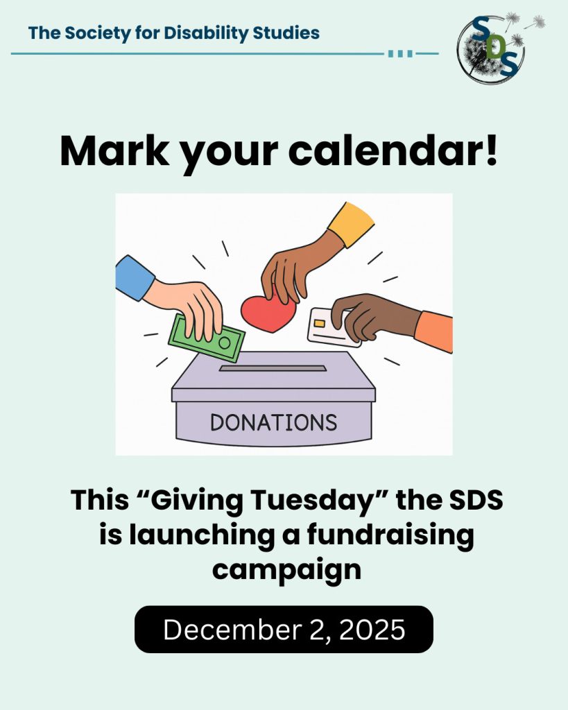 This year, the Society for Disability Studies (SDS) joins nonprofits around the world in launching a fundraising campaign for “Giving Tuesday” on December 2, 2025! Whether you are working on your regular slate for year-end giving among the many organizations in your orbit, or are a new member looking for ways to join in SDS’s work, please consider supporting SDS next week.